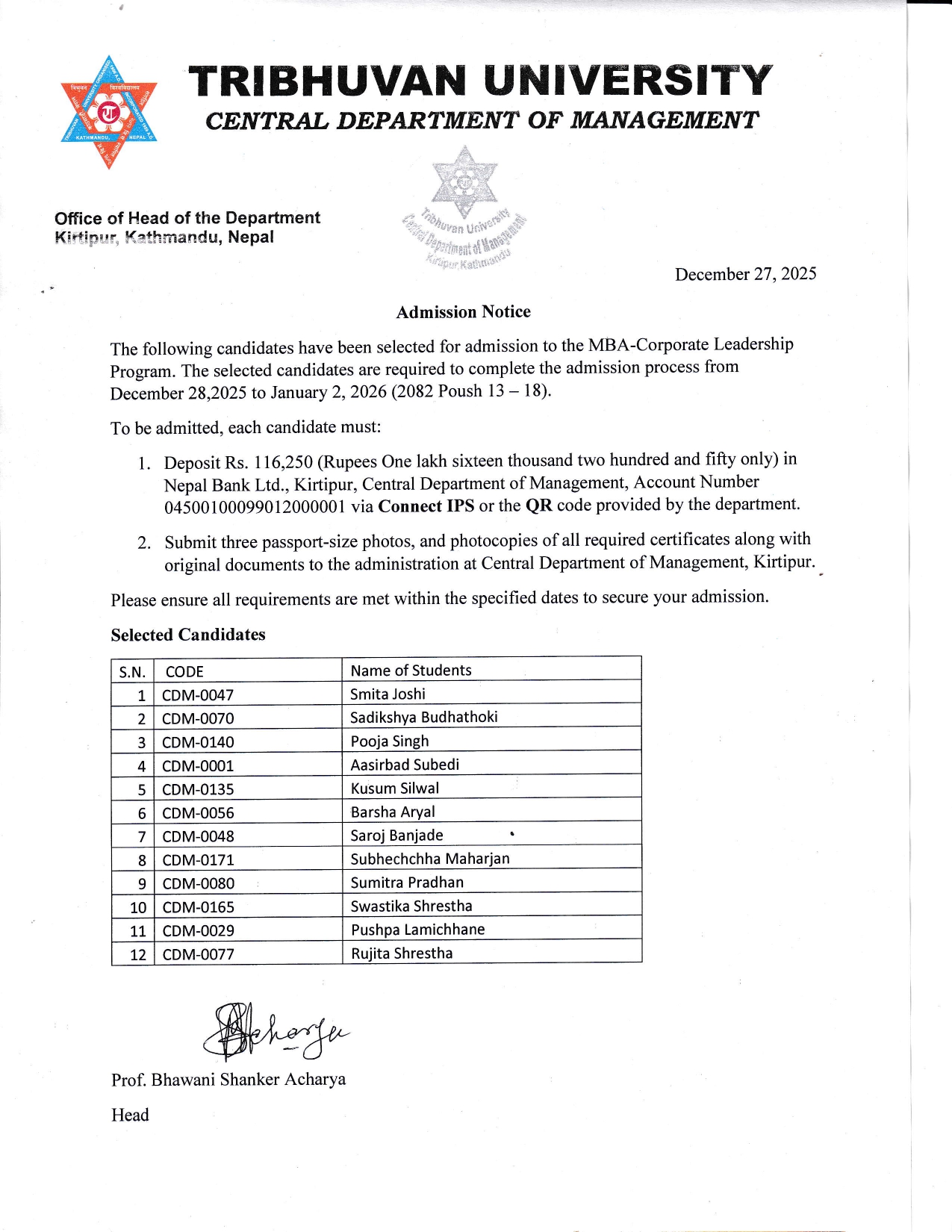 Final Result of Group Discussion,Individual Presentation,Personal Interview .....The following Candidates have been selected for Admission in specialized MBA-CL ..Congratulations !!!