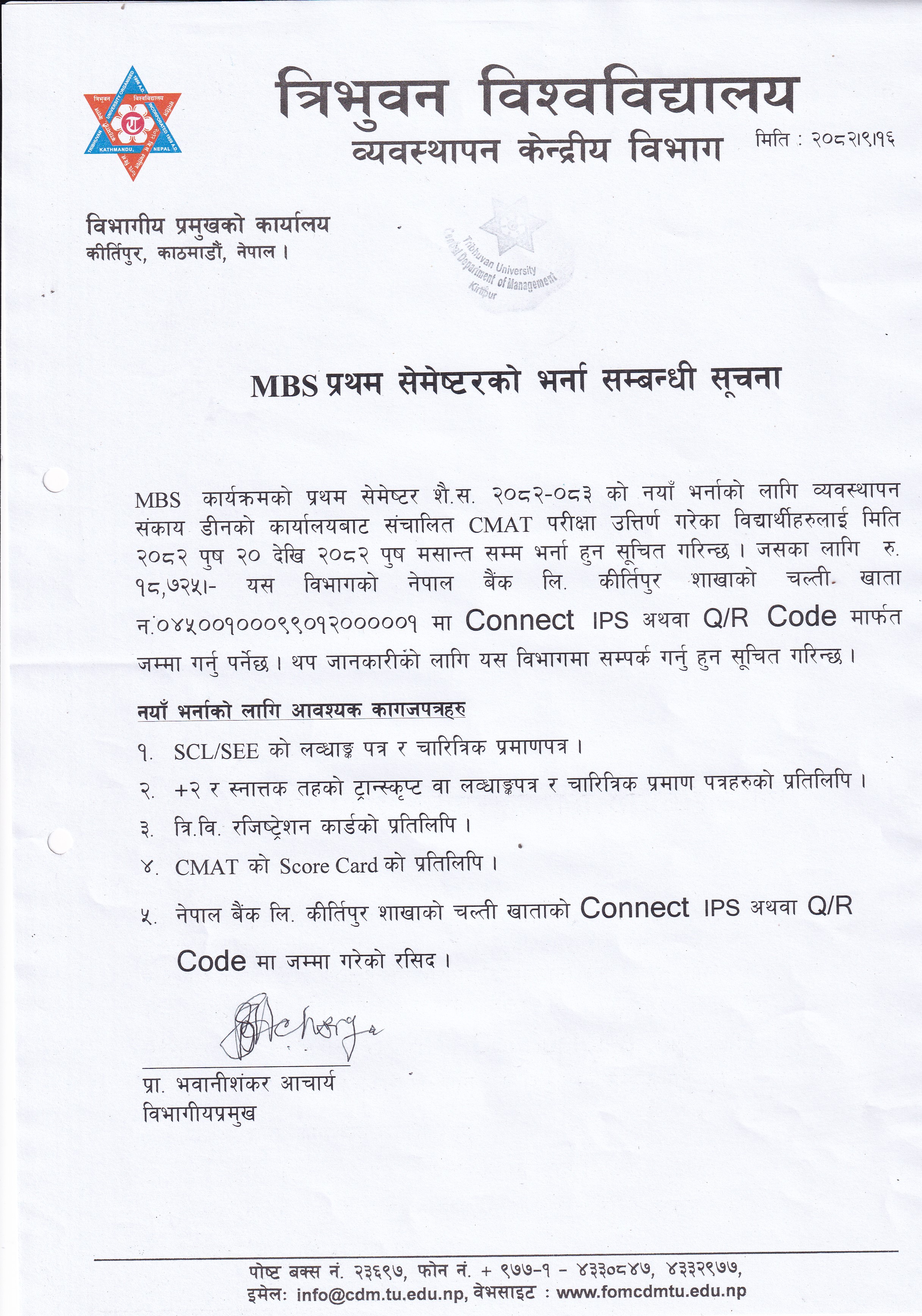 MBS प्रथम सेमेषटरको भर्ना म्याद थप सम्बन्धमा