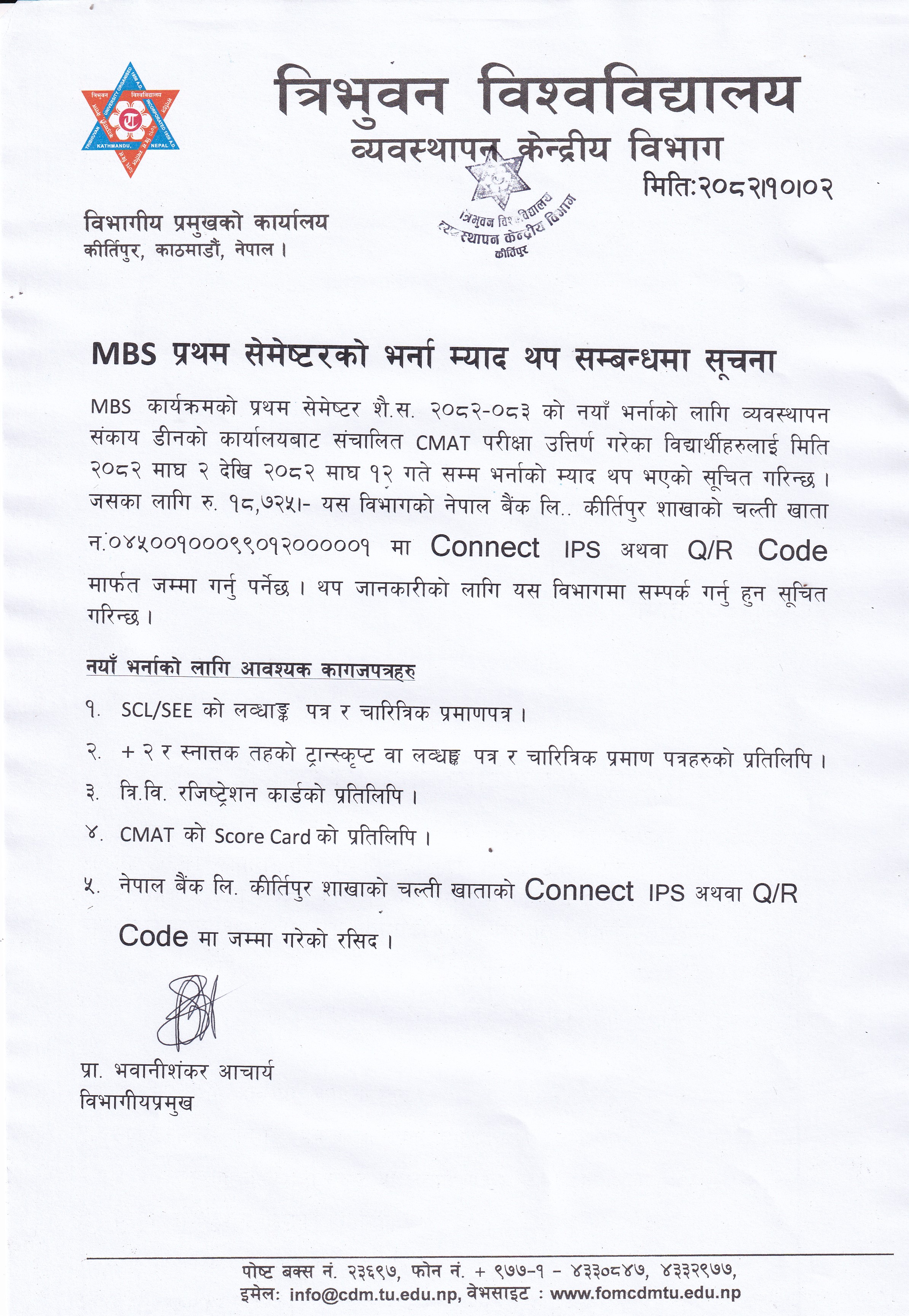 MBS प्रथम सेमेषटरको भर्ना म्याद थप सम्बन्धमा