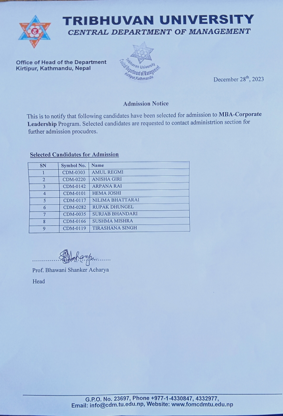 Admission Test Result MBA- Corporate Leadership 2023
