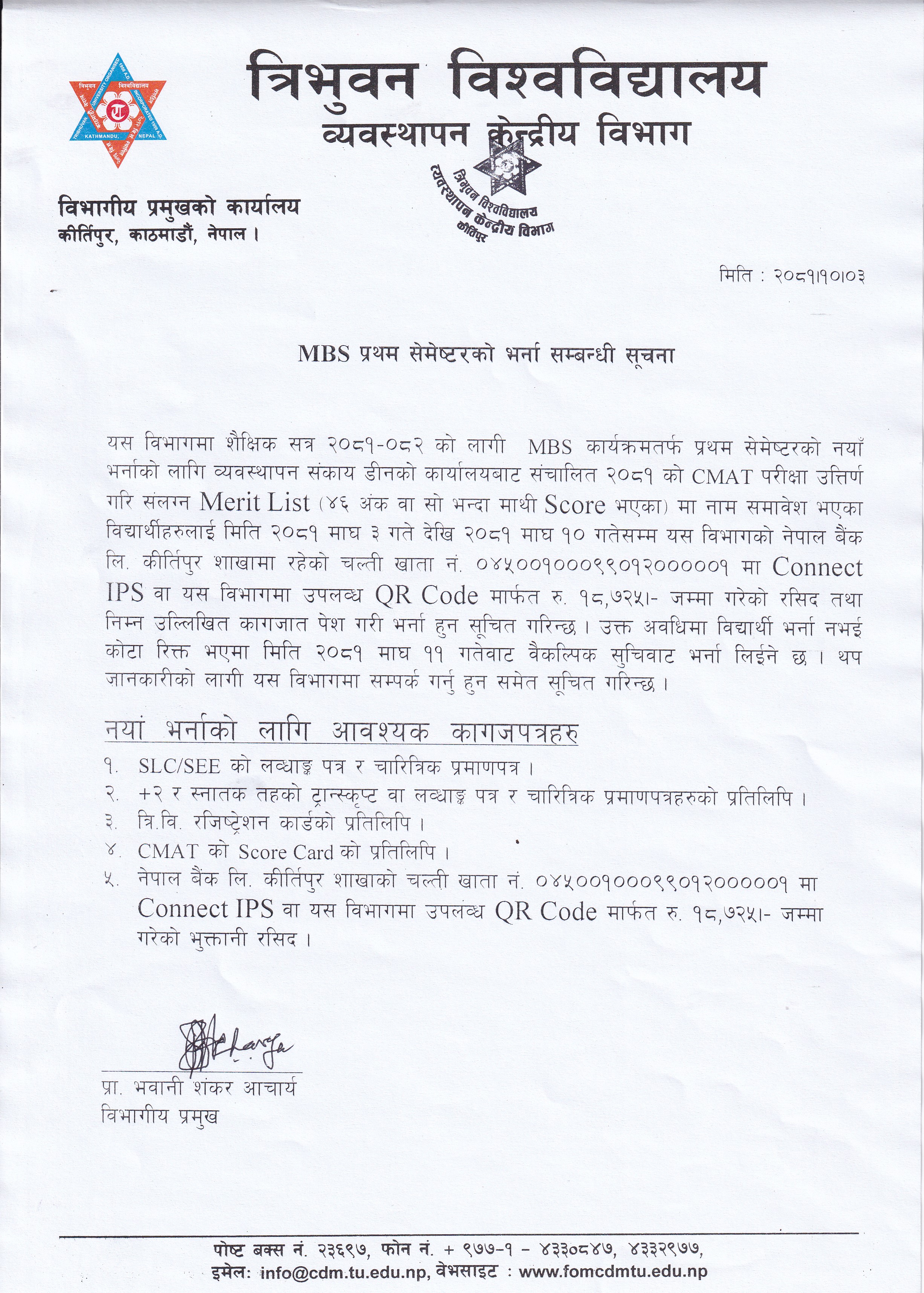 MBS प्रथम सेमेस्टरको भर्ना सम्बन्धी सुचना
